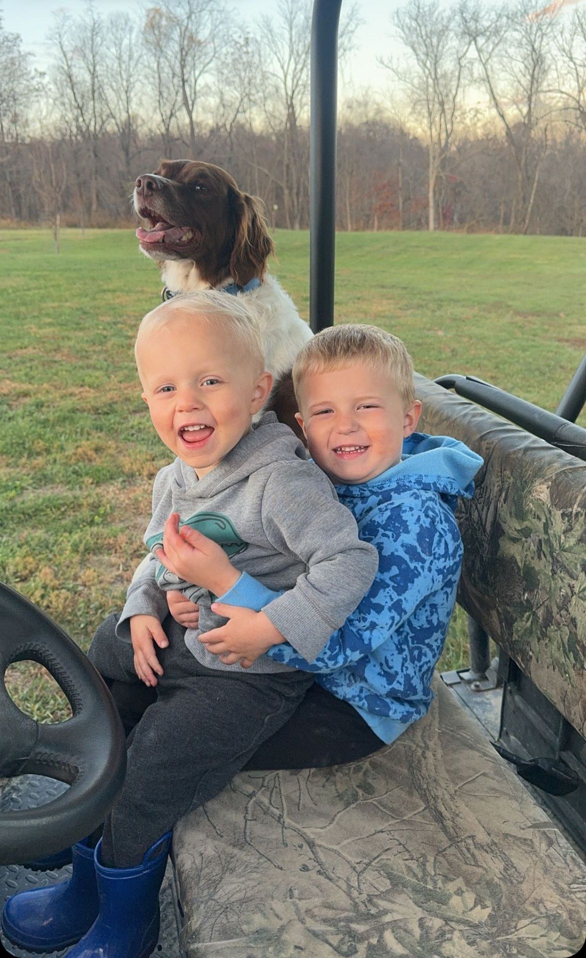We have two dogs (Deacon & Blackie) who are a much-loved part of our family and are wonderful companions to our children. They are gentle, patient, and add joy to our every day life. Our boys ensure their dogs are included in all that we do, and they especially enjoy tagging along with us on side-by-side rides around the farm!